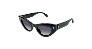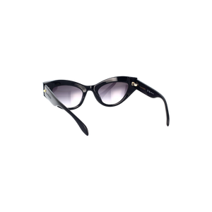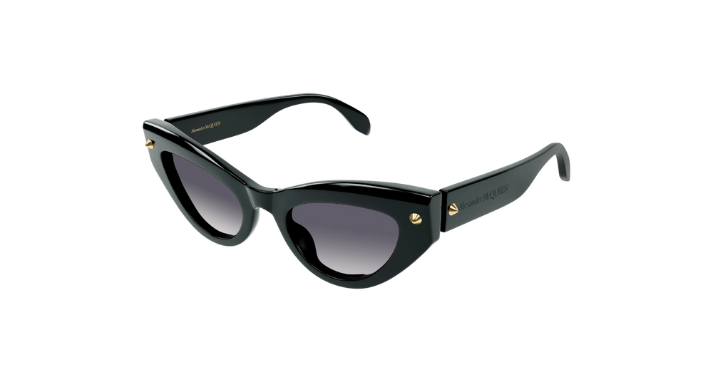 Las Alexander McQueen AM0407S reinterpretan la silueta cat-eye con un enfoque más escultural y sofisticado. Su montura de acetato negro brillante aporta volumen y presencia, mientras los detalles metálicos dorados en las esquinas añaden un toque distintivo y elegante.