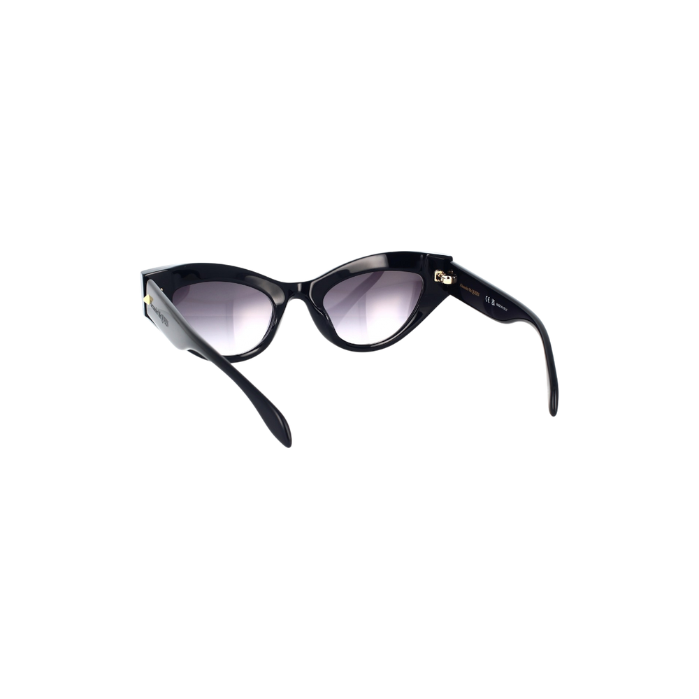 Los lentes en degradé gris complementan el diseño con una estética moderna y femenina, ofreciendo protección y estilo en un solo accesorio. Son la elección perfecta para quienes buscan unas gafas sofisticadas, llamativas y con el sello inconfundible de la casa McQueen.