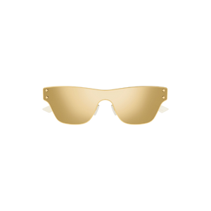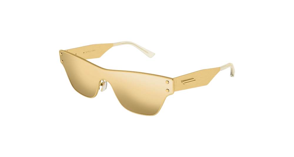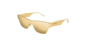 Las Bottega Veneta BV1148S 00299 son una declaración absoluta de estilo. Su diseño tipo shield (visor) en acabado totalmente dorado crea un efecto futurista y sofisticado, mientras que la montura metálica pulida y las varillas geométricas con aplique dorado elevan el diseño a un nivel de lujo contemporáneo incomparable.