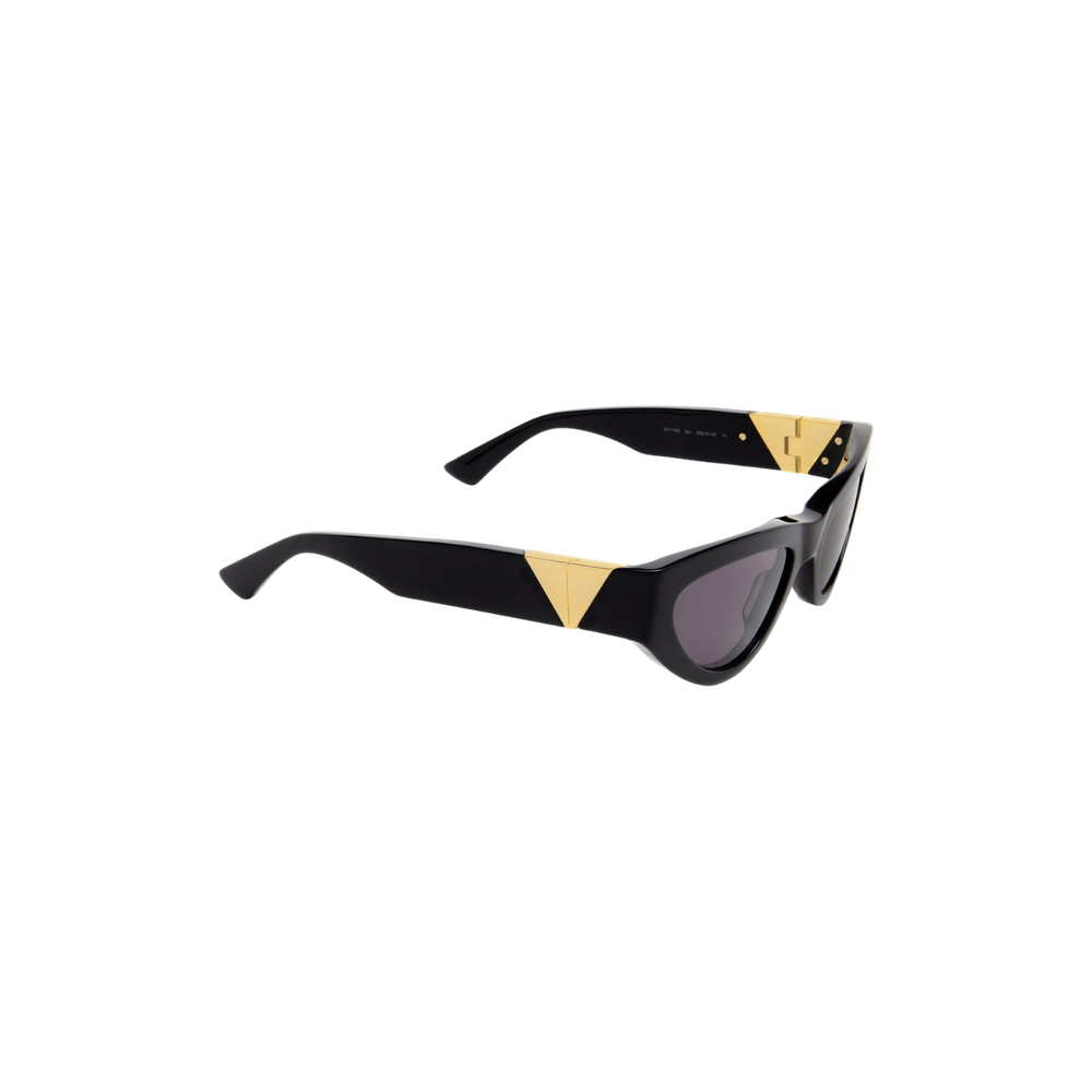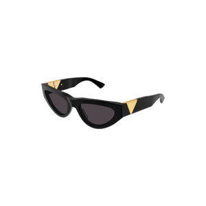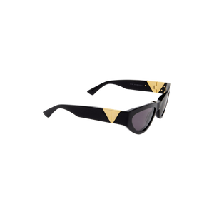 Una obra maestra de diseño contemporáneo que combina elegancia y fuerza visual. Estas gafas de sol presentan una silueta tipo cat-eye con una montura gruesa en acetato negro brillante, acentuada por detalles metálicos dorados en forma triangular que evocan la arquitectura moderna característica de Bottega Veneta.