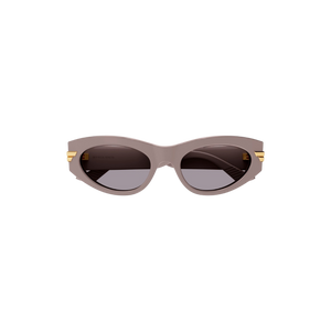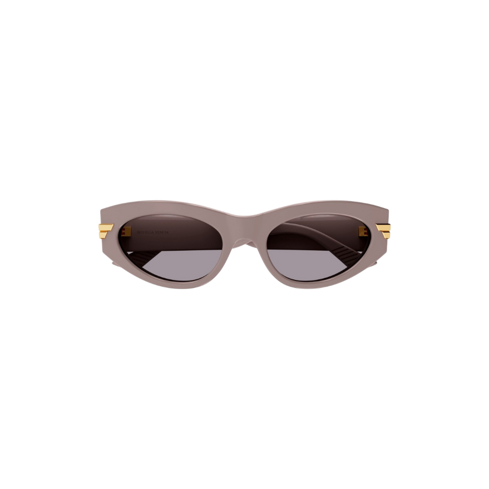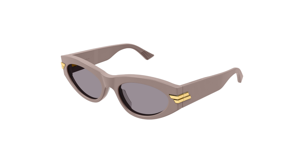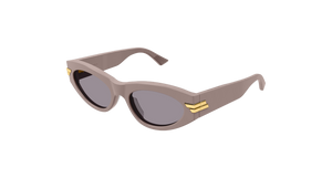 Las Bottega Veneta BV1189S 00653 combinan una silueta cat-eye moderna con una elegancia minimalista característica de la maison. Su montura gruesa en un tono nude sofisticado se complementa con apliques metálicos dorados en forma de alas sobre ambas varillas, aportando un toque distintivo y refinado.