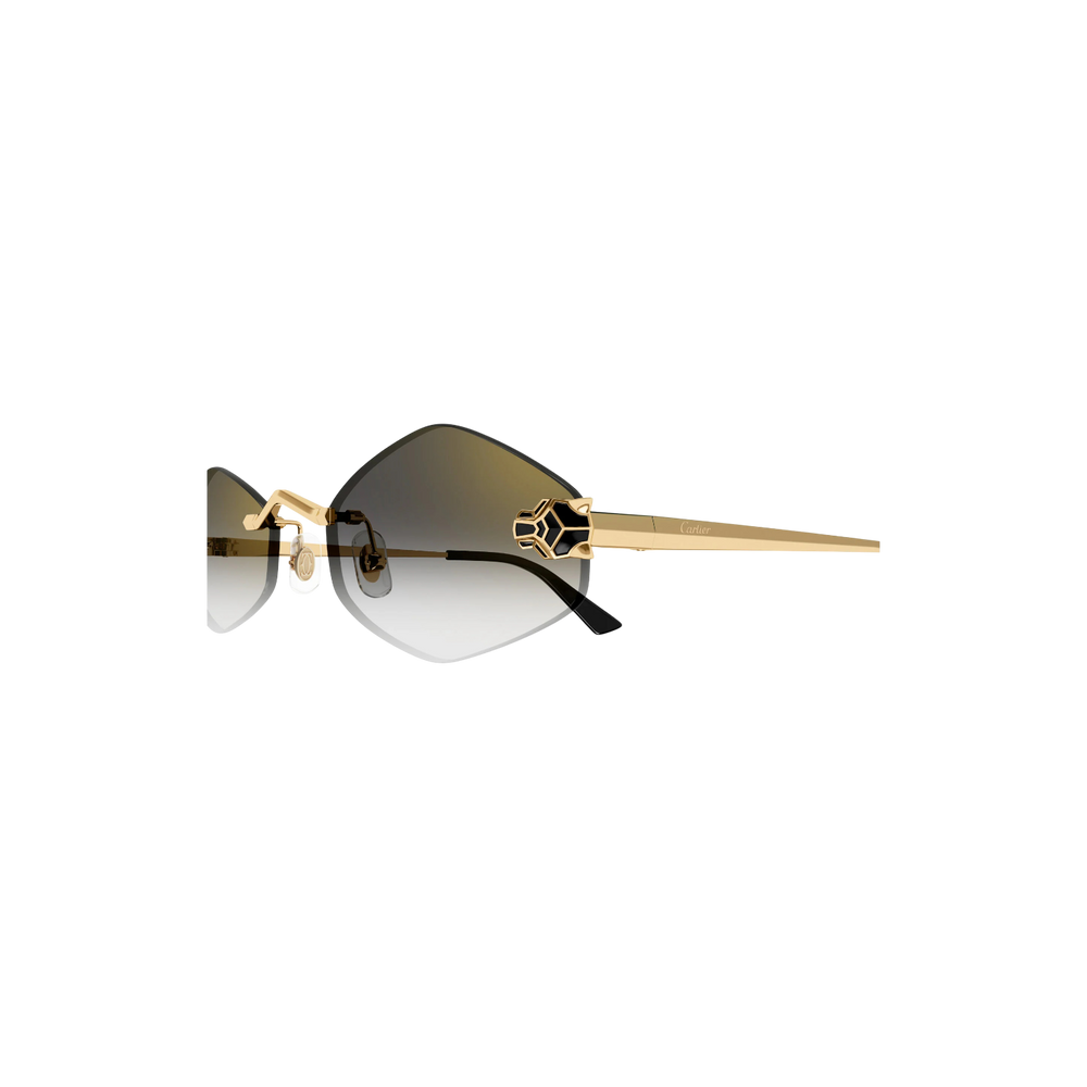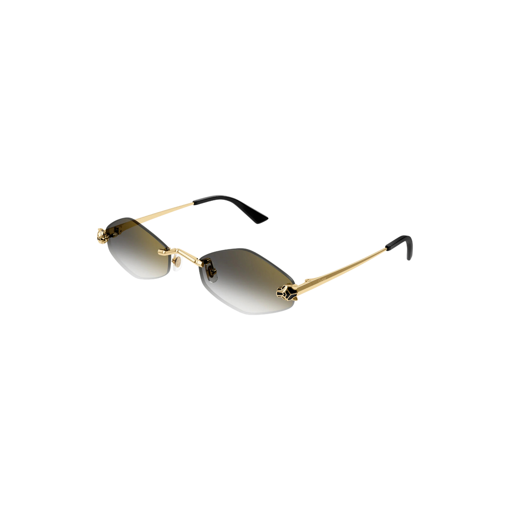 Un modelo de líneas rectangulares que destaca por su montura metálica dorada de gran ligereza y un diseño sin marco que aporta modernidad y minimalismo. Los lentes oscuros contrastan con el dorado, ofreciendo un look elegante y distintivo. Las varillas estilizadas, con acabados de alta precisión, reflejan el sello de exclusividad de Cartier en cada detalle.
