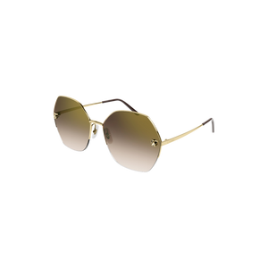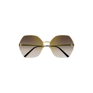 Las gafas de sol Cartier modelo CT0332S - 00262 presentan un diseño hexagonal sin montura, elaborado en metal dorado que refleja la elegancia y sofisticación características de la marca. Este modelo destaca por la incorporación de la emblemática cabeza de pantera tridimensional en las lentes, símbolo distintivo de Cartier, que aporta un toque de lujo y exclusividad. Las lentes degradadas ofrecen protección contra los rayos UV, asegurando una visión clara y segura. Estas gafas son ideales para ocasiones formales y eventos especiales, complementando un estilo refinado y contemporáneo.