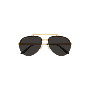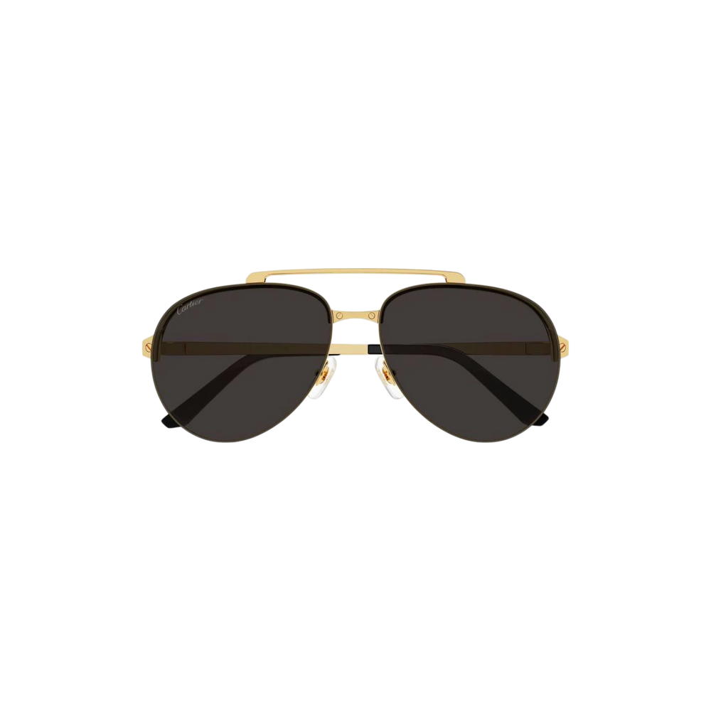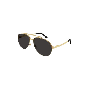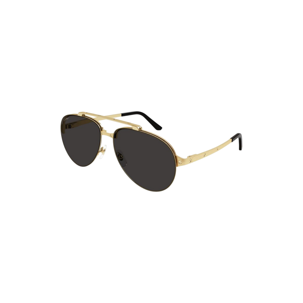 Las gafas CT0354S de Cartier son un modelo de gafas de sol para hombre con diseño tipo aviador. Presentan una estructura metálica en color oro brillante, combinada con lentes gris humo. Sus dimensiones son: