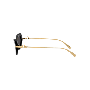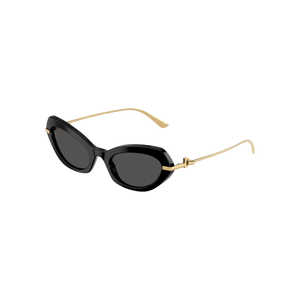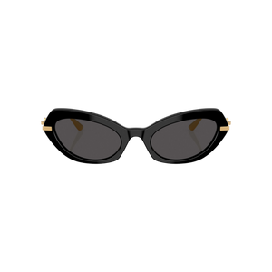Diseño femenino tipo mariposa con carácter sofisticado. Estas gafas destacan por su montura en acetato negro brillante, combinada con elegantes patillas metálicas doradas que realzan el estilo y el lujo. Las lentes gris oscuro ofrecen protección total contra los rayos UV, asegurando una visión cómoda y segura.