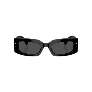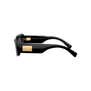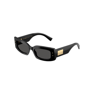 Gafas de sol DG4479 de Dolce & Gabbana en elegante acetato negro con detalles dorados en varillas. Lentes gris oscuro categoría 3 con protección UV total. Diseño rectangular contemporáneo, ideal para uso diario y conducción. Incluye estuche rígido, paño y garantía de 2 años.