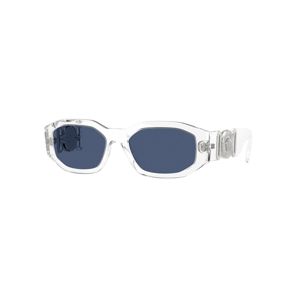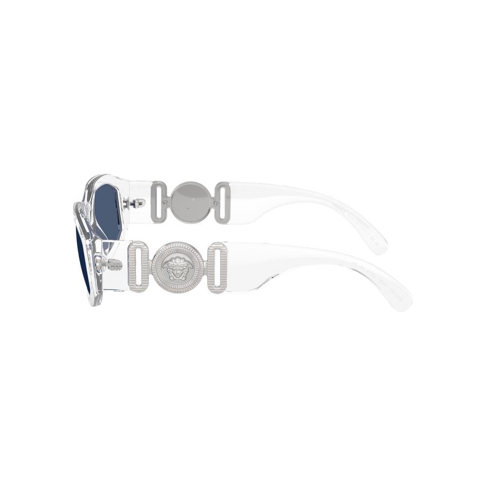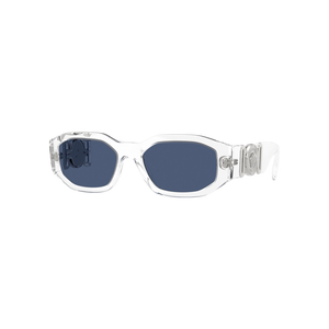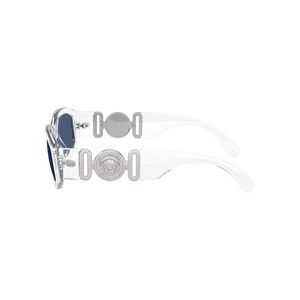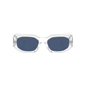 En las patillas se luce el icónico logotipo de Medusa en metal dorado y remates Greca, generando un contraste atrevido con la transparencia de la montura . Los lentes azul oscuro ofrecen protección UV 400 al 100 % (categoría 3), sin filtro polarizado, ideales para una visión cómoda y clara en alto brillo.