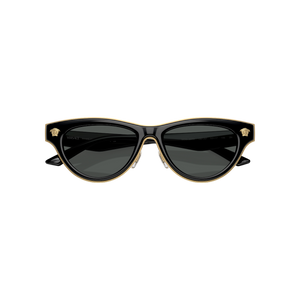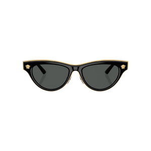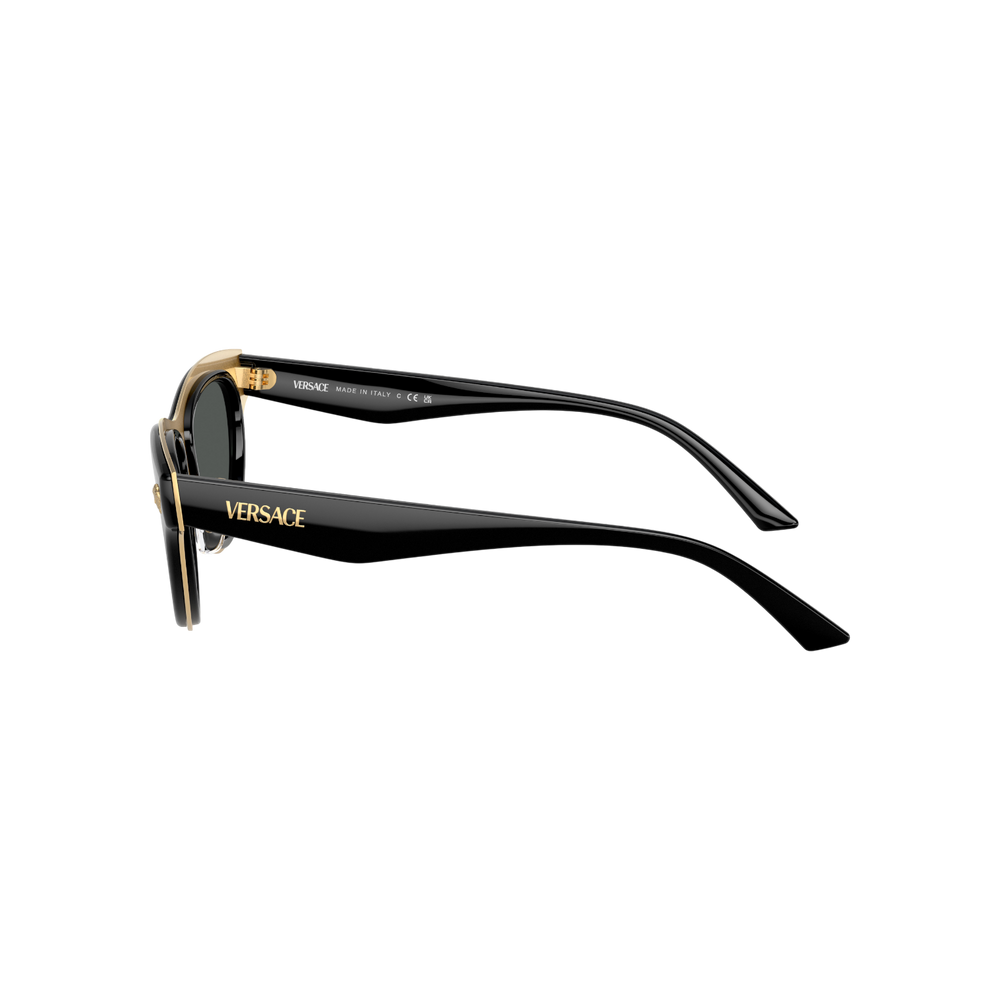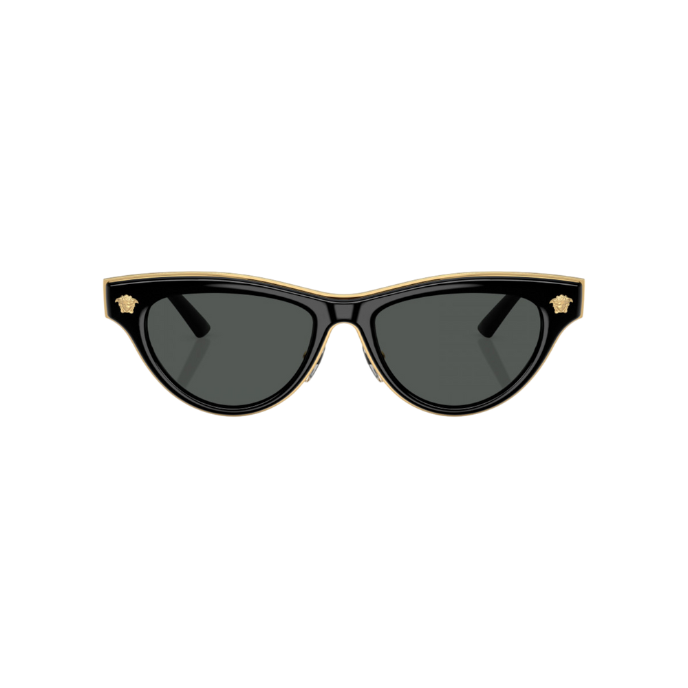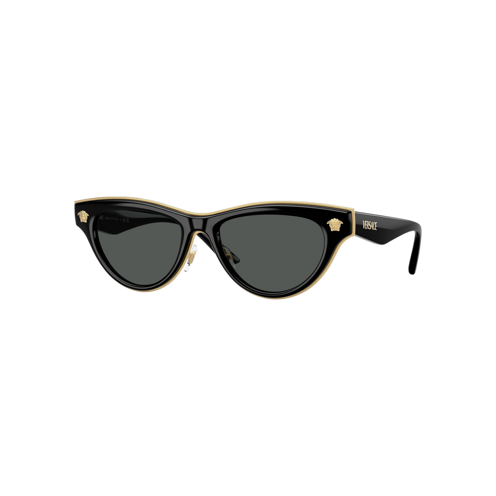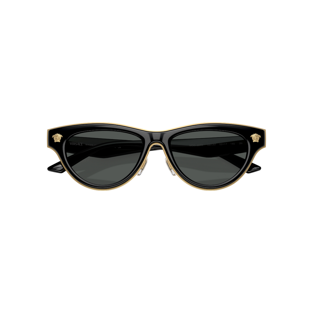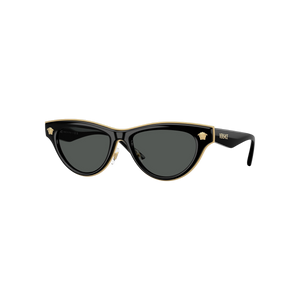 Estas gafas de sol Versace modelo VE 2273 (GB1/87 52) presentan una silueta femenina tipo cat‑eye sofisticada, con montura completa en color negro brillante realzada por un fino ribete dorado interior y varillas compuestas de metal frontal e inyección de acetato, con el logo clásico de Medusa discretamente grabado. Sus lentes gris oscuro ofrecen protección UV 100 % (filtro de categoría 3) sin polarización, ideales para mantener una visión clara y cómoda en ambientes soleados.
