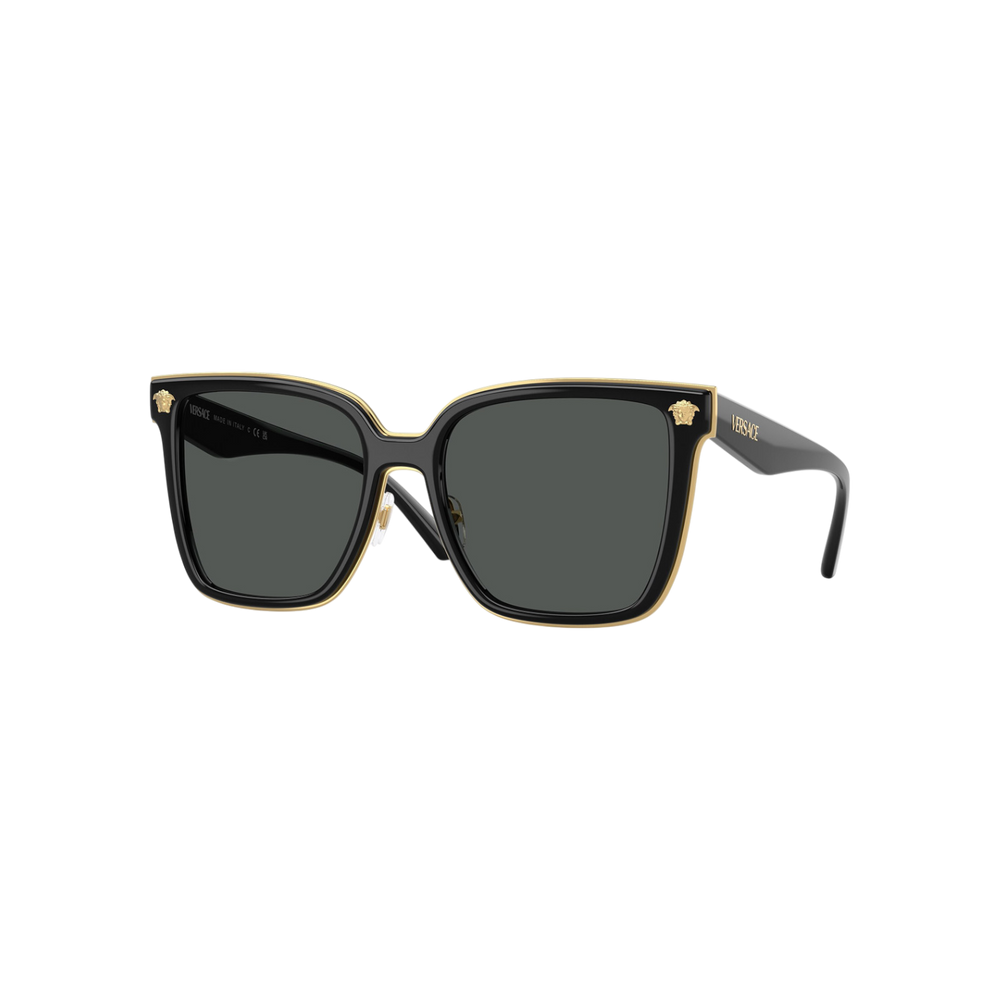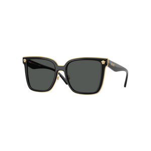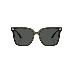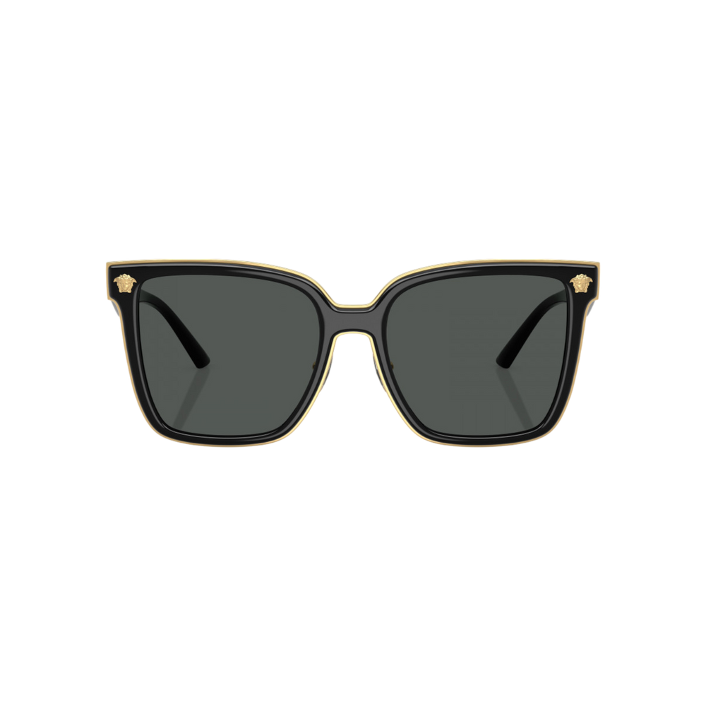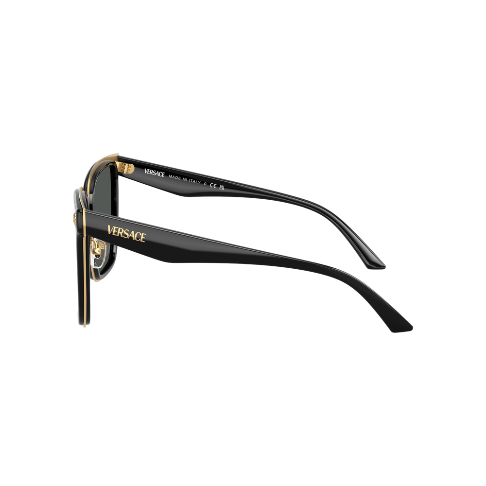 Estas gafas de sol Versace modelo VE 2278D (código GB1/87 58) presentan una silueta tipo “butterfly” amplia y femenina que combina una montura metálica negra completa con varillas inyectadas en el mismo tono, realzadas por una delicada plaquita de Medusa en metal dorado en las patillas, símbolo distintivo de la firma.