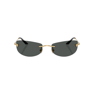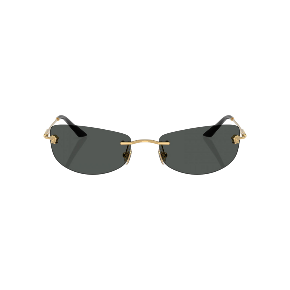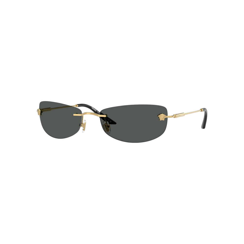 Las gafas de sol Versace modelo VE2279 (código 10028760) presentan un diseño unisex futurista y minimalista, con estructura sin montura visible que realza su forma rectangular alargada. Las lentes en gris oscuro están sujetas por tornillos discretos que dan una sensación de ligereza y flotación visual.