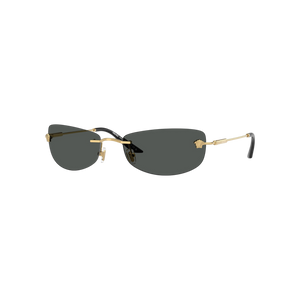 La montura es metálica en tono negro con acabado mate, mientras que las varillas tubulares incorporan detalles dorados y el distintivo grabado del logo de Versace, además del icónico emblema de Medusa en los extremos. Este modelo no solo aporta estilo, sino también funcionalidad, ya que sus lentes ofrecen protección UV 100 % y filtro solar de categoría 3, ideales para condiciones de alta luminosidad.