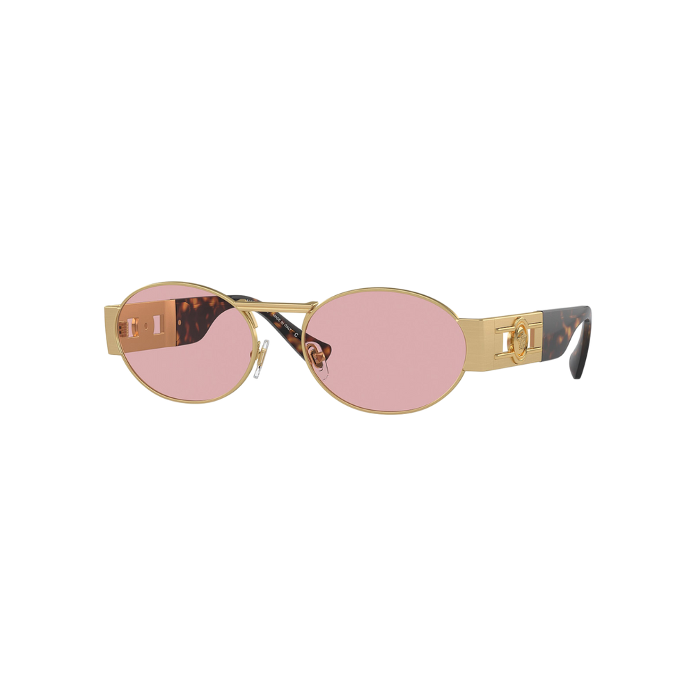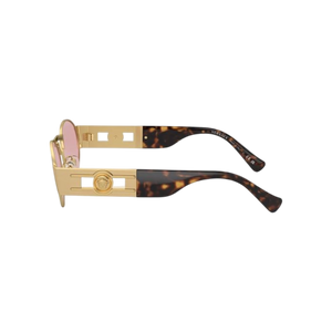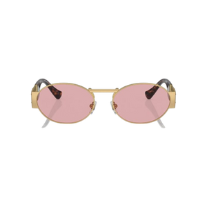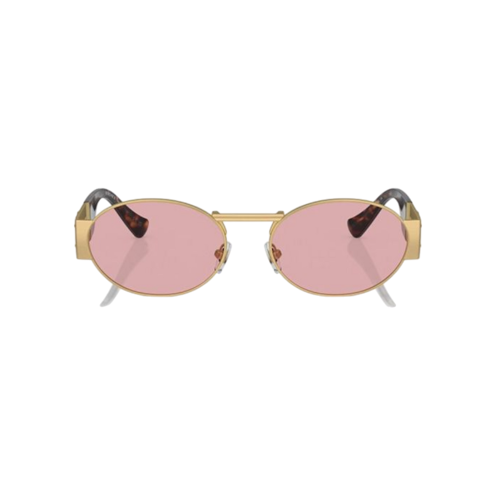 Estas gafas de sol unisex Versace modelo VE 2264 (ref. 10028456) presentan un diseño ovalado retro renovado, con montura metálica en acabado dorado mate que aporta sofisticación y ligereza. Los lentes rosas (light violet) ofrecen protección UV 100 % sin polarización, equilibrando elegancia y funcionalidad para un uso diario. Los detalles laterales incluyen el icónico logo de Medusa en relieve en los templos y combinan elementos en carey para añadir dimensión visual.