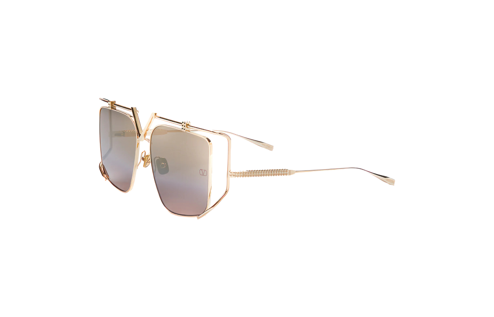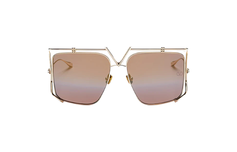 Las Valentino V-Light VLS-116B 59 son gafas de sol de diseño estructural y sofisticado. Su montura metálica en tono dorado claro combina con lentes cuadradas oversize en marrón degradado con acabado espejo dorado, ofreciendo un look moderno y elegante. El diseño resalta por su ligereza gracias al titanio, mientras que los detalles en las varillas reflejan el sello distintivo de la Maison Valentino