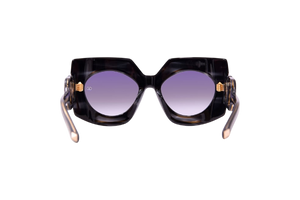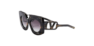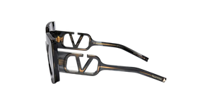 Las Valentino V-Soul VLS-127A 53 destacan por su geometría cuadrada/“butterfly” con marco en acetato negro estilo swirl, combinando elegancia y carácter moderno. El borde metálico dorado del alambre central aporta contraste y sofisticación. Las lentes tienen tonalidad gris degradada con efecto espejo y ofrecen protección total contra los rayos UV. El diseño oversize les da presencia, mientras que las varillas en acetato con detalles rockstud rematan el estilo con distintivo Valentino.