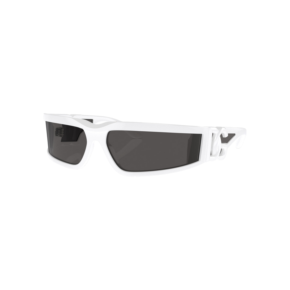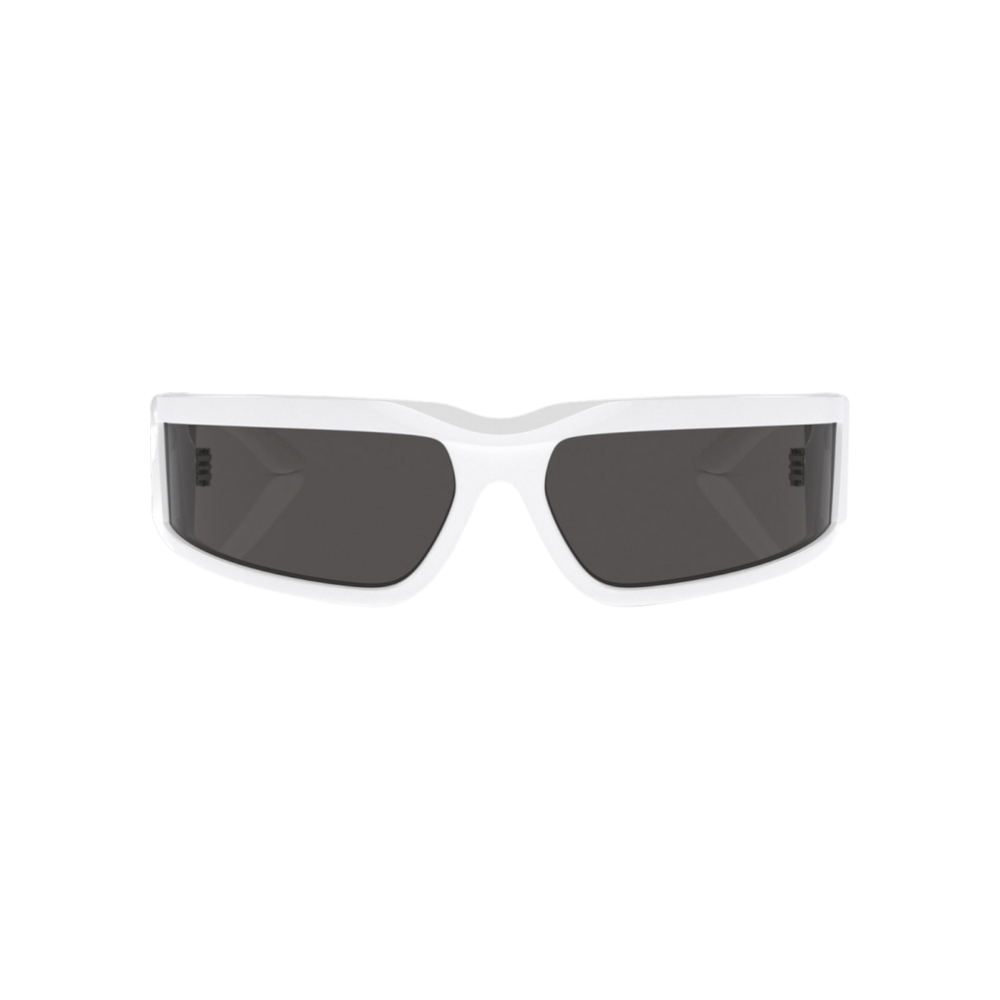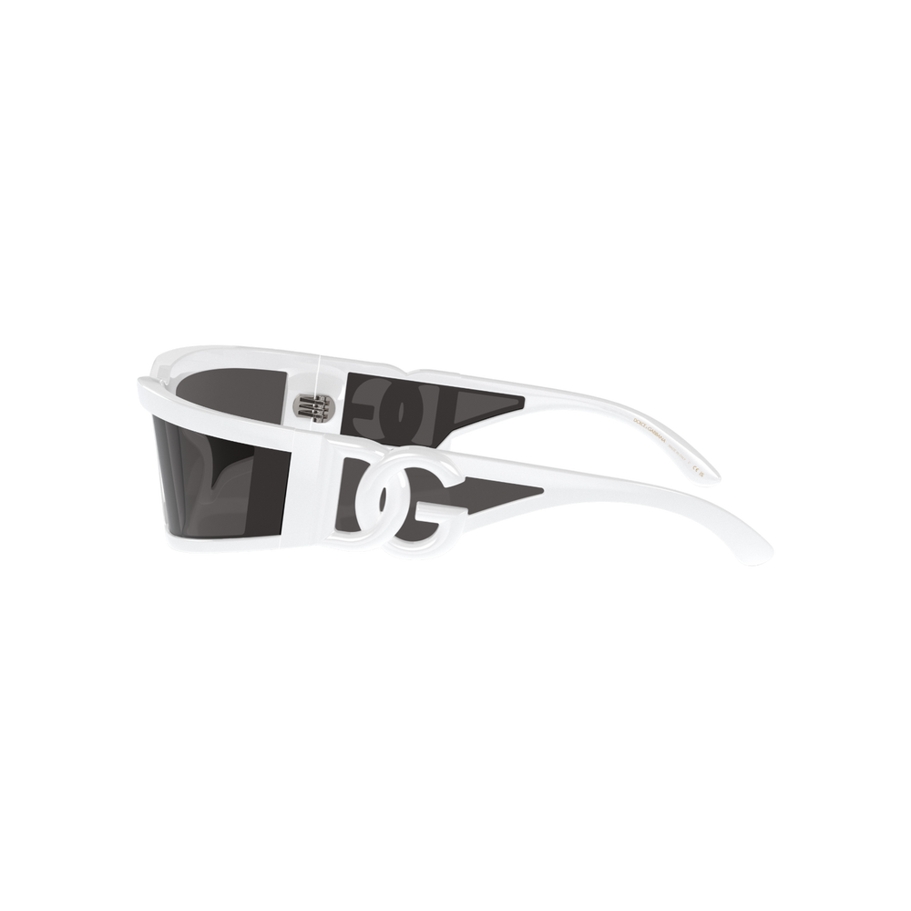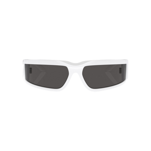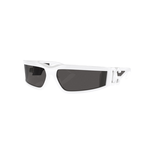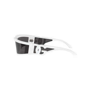 Las gafas DG6198 de Dolce & Gabbana combinan una montura envolvente de acetato color blanco opaco con lentes gris oscuro, creando un look moderno y deportivo con un toque de alta moda. Su diseño tipo visor rectangular cubre y estiliza el rostro, mientras el logo metálico DG en las patillas resalta con elegancia.
