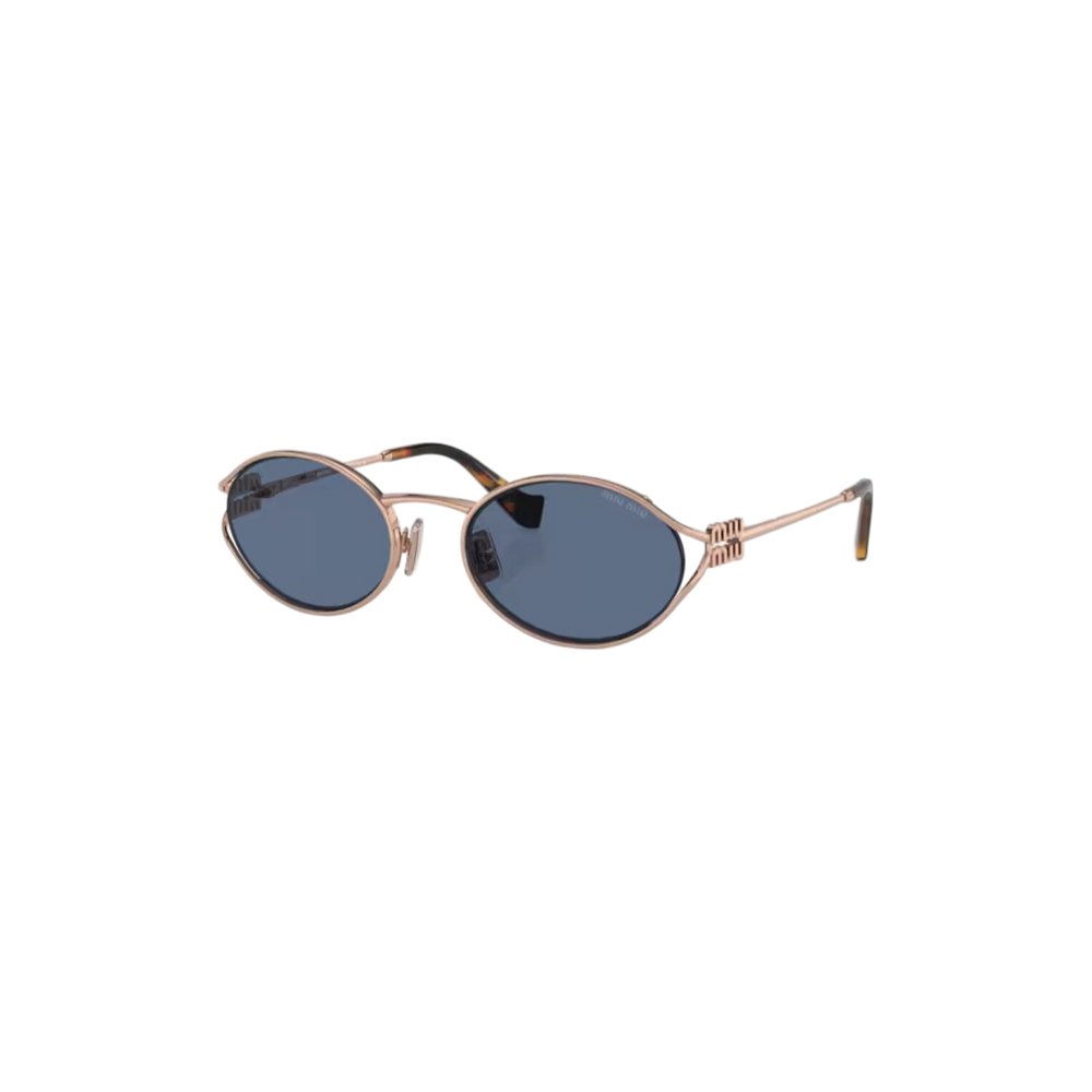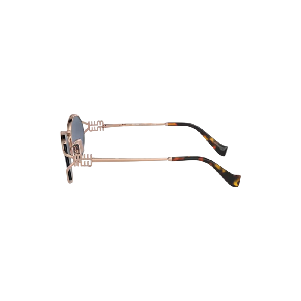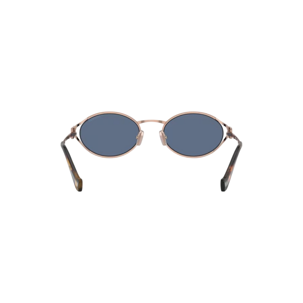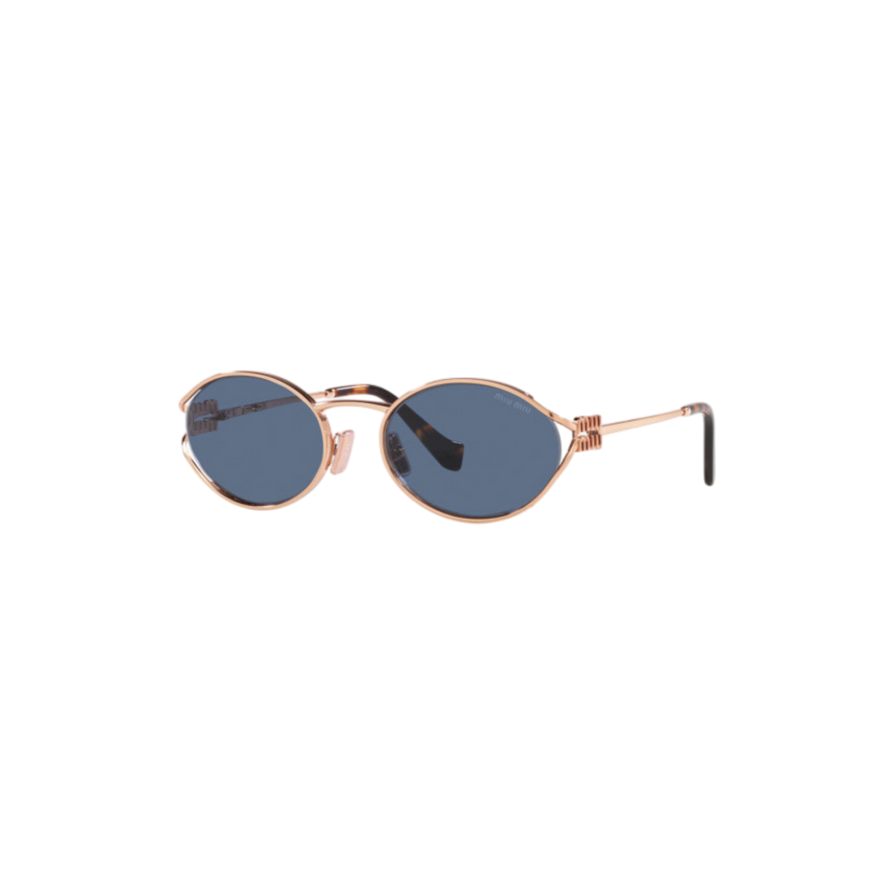 Las gafas de sol Miu Miu modelo MU52YS presentan un diseño ovalado con una montura de metal en tono oro rosa y lentes azules, ofreciendo una estética moderna y sofisticada. Estas gafas son ideales para ocasiones casuales y formales, aportando un toque de distinción a cualquier atuendo.