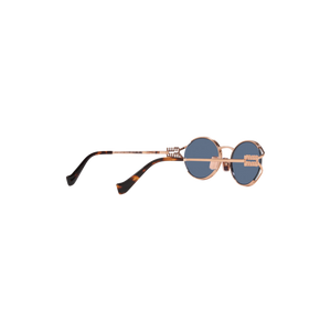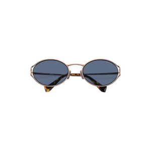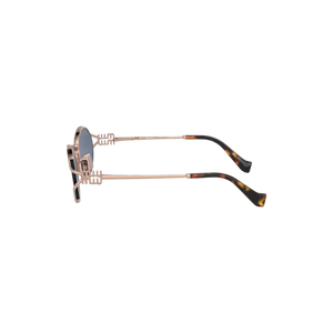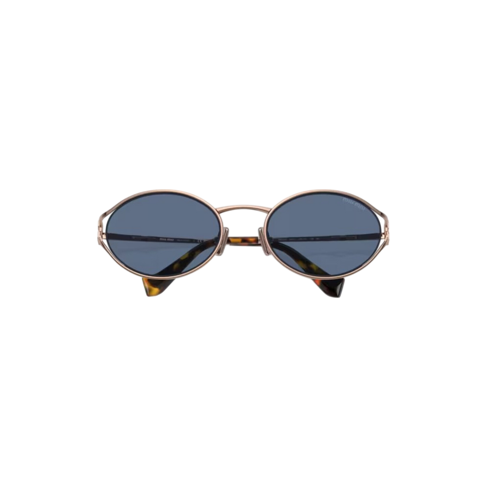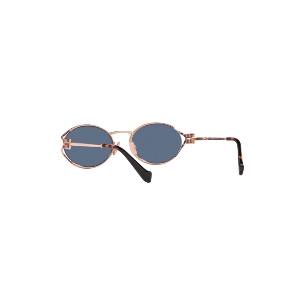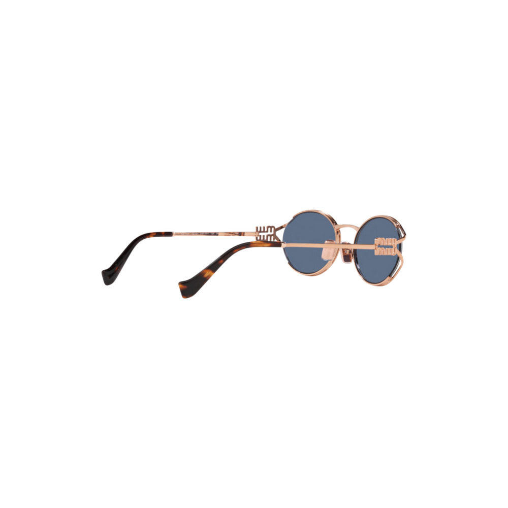 Las gafas de sol Miu Miu modelo MU52YS presentan un diseño ovalado con una montura de metal en tono oro rosa y lentes azules, ofreciendo una estética moderna y sofisticada. Estas gafas son ideales para ocasiones casuales y formales, aportando un toque de distinción a cualquier atuendo.