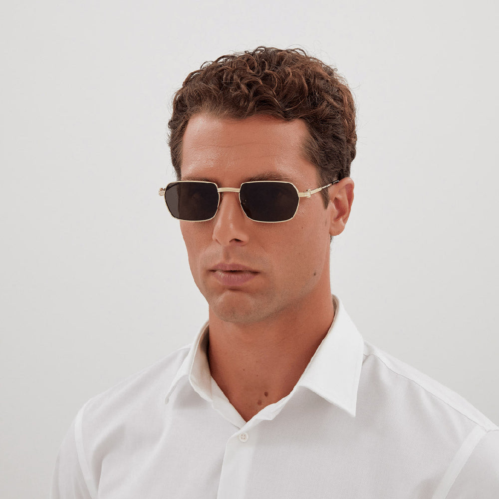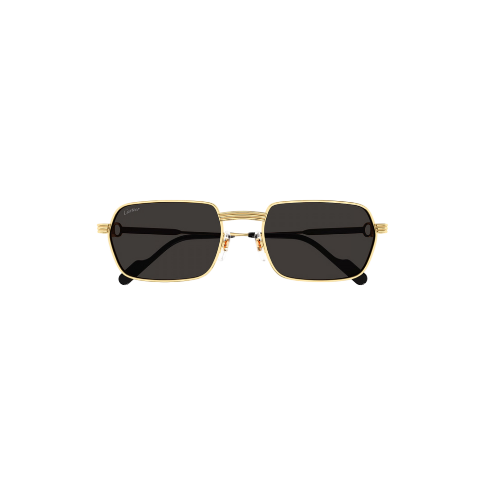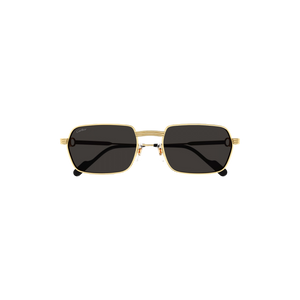 Las gafas de sol Cartier modelo CT0463S, en su variante 00156, presentan un diseño sofisticado y elegante caracterizado por una montura metálica dorada y lentes grises. La forma rectangular de la montura aporta un toque contemporáneo, mientras que los detalles emblemáticos de Cartier, como el motivo "C Décor" y el detalle "Godron" en las bisagras, realzan su exclusividad.