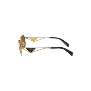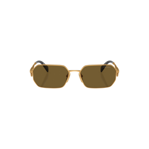 Las gafas de sol Prada modelo PRA51S - 15N01T58 combinan elegancia y modernidad en un diseño sofisticado. Su montura metálica en tono dorado mate presenta una forma irregular que aporta un toque distintivo y contemporáneo. Las lentes marrón oscuro ofrecen una protección óptima contra los rayos UV, siendo ideales para condiciones de luz intensa.