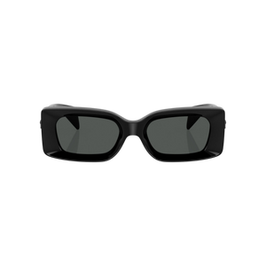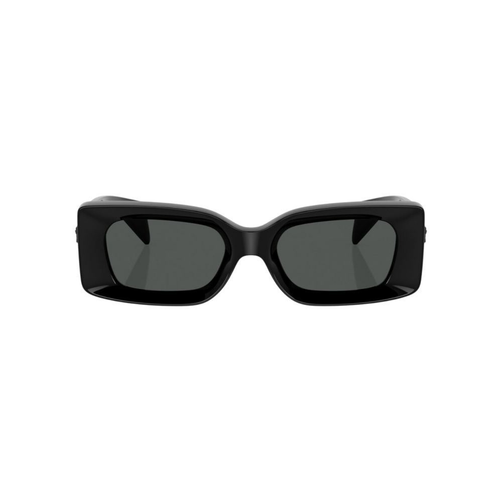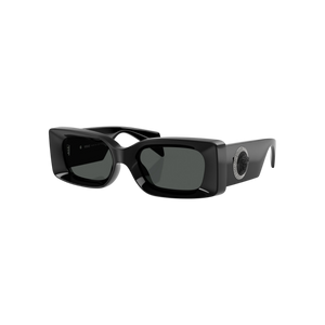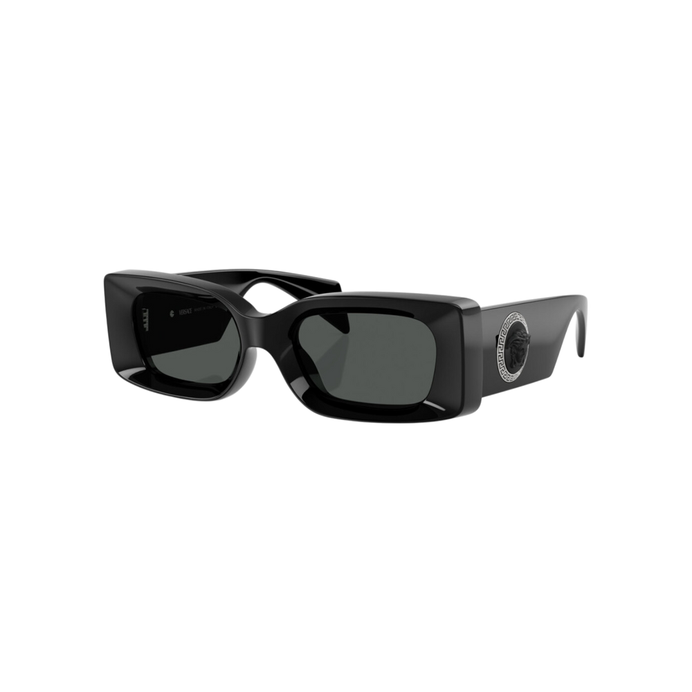 Estas gafas de sol unisex de Versace combinan un estilo contemporáneo con toques clásicos, presentando una montura rectangular en acetato negro que destaca por su acabado pulido y detalles metálicos en las bisagras con el emblemático logo de la marca. Sus lentes oscuros ofrecen una protección UV alta, ideales para proteger tus ojos en cualquier situación, desde paseos en la ciudad hasta eventos al aire libre.