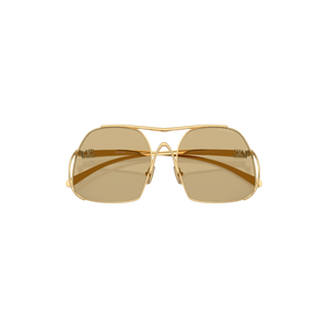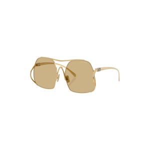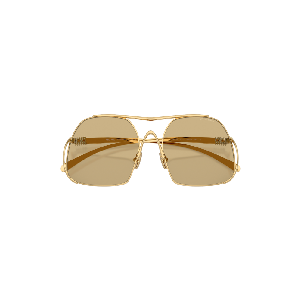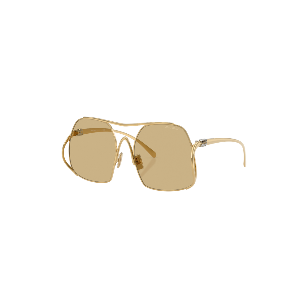 Este modelo presenta una silueta oversize geométrica con lentes doradas que se integran perfectamente en una estructura metálica ultrafina en acabado gold premium, creando un efecto de lujo moderno propio de MIU MIU.