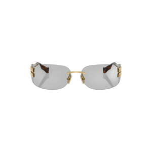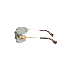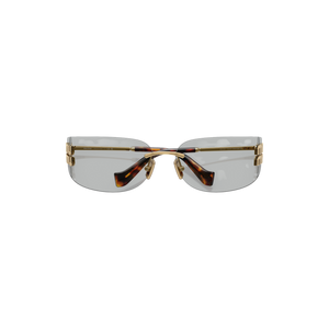 Las gafas de sol Miu Miu modelo MUA51S - 5AK50K75 destacan por su diseño rectangular sin montura, confeccionadas en metal dorado que aporta un toque de sofisticación y modernidad. Las lentes de color gris claro ofrecen una protección óptima contra los rayos UV, siendo ideales para condiciones de luz intensa.