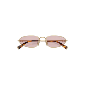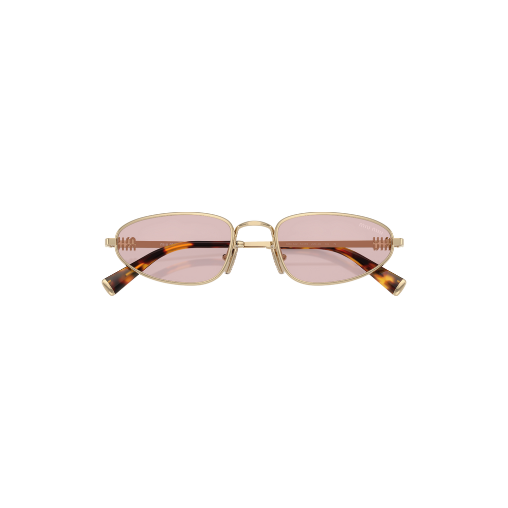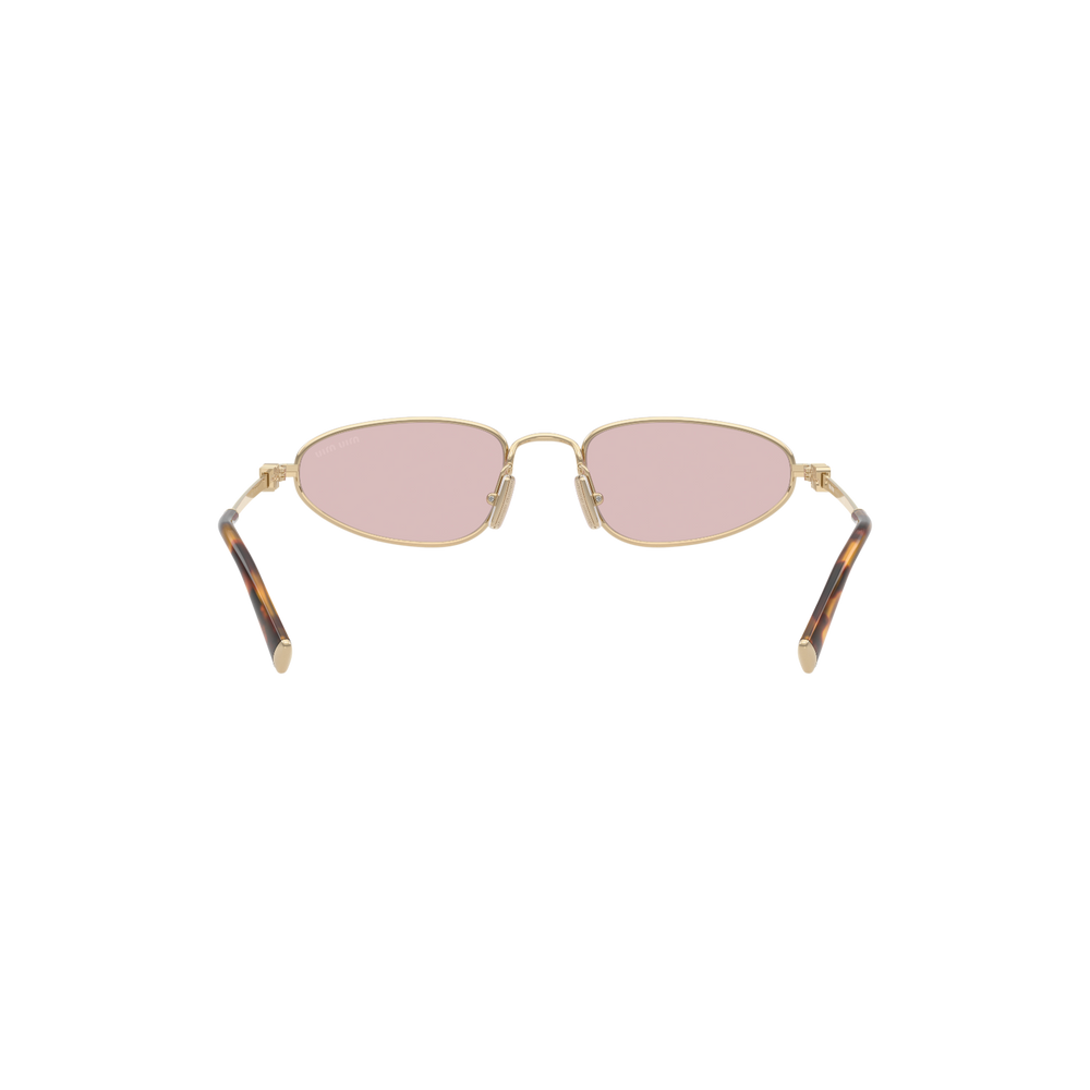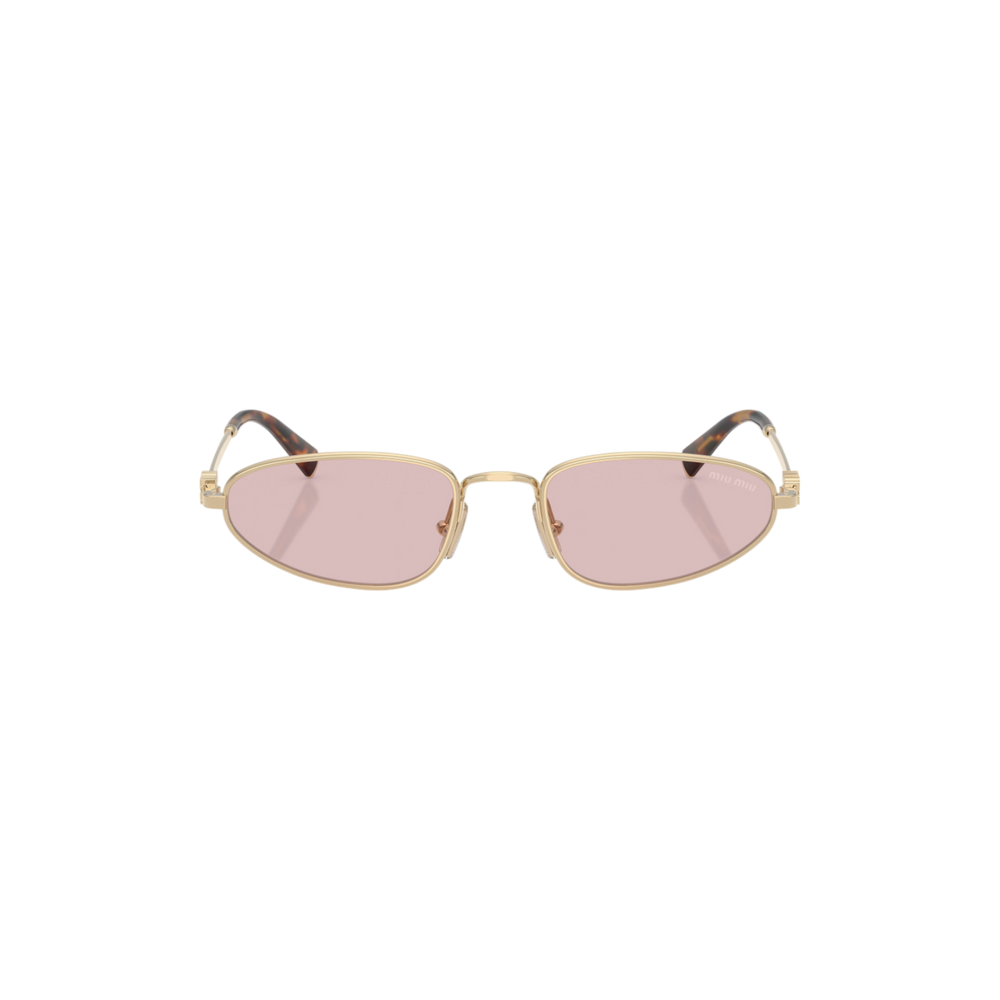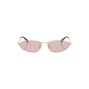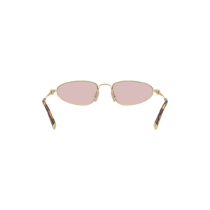 Las gafas de sol Miu Miu modelo MUA52S - ZVN4I052 destacan por su diseño ovalado y sofisticado, confeccionadas en metal de alta calidad en tono dorado que aporta un toque de elegancia y modernidad. Las lentes en color rosa claro ofrecen una protección óptima contra los rayos UV, siendo ideales para condiciones de luz suave.