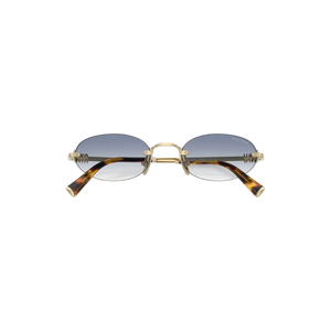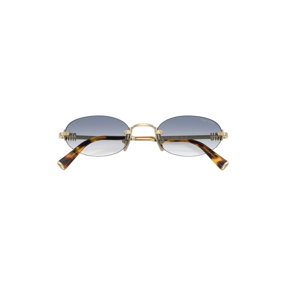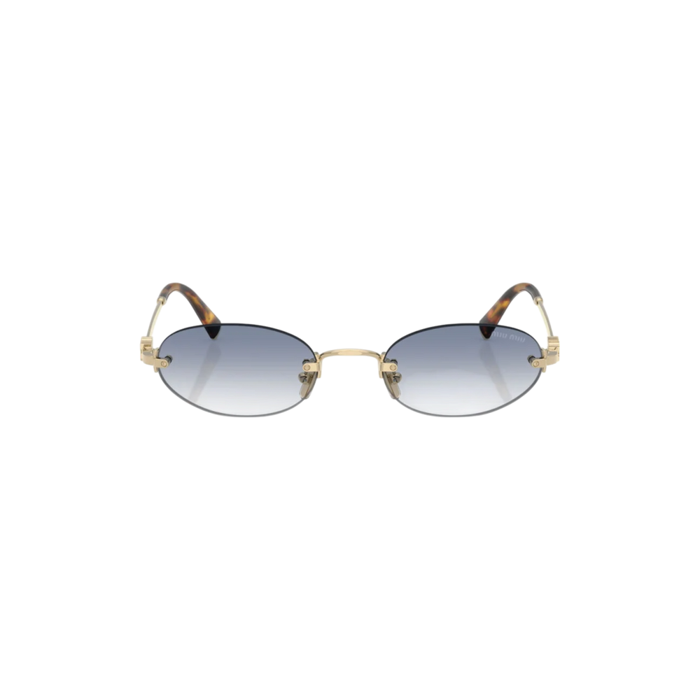 Las gafas de sol Miu Miu modelo MUA54S - ZVN80O51 presentan un diseño ovalado y sin montura, confeccionadas en metal dorado pálido que aporta un toque de sofisticación y modernidad. Las lentes en tonos azul degradado ofrecen una protección óptima contra los rayos UV, siendo ideales para condiciones de luz suave.