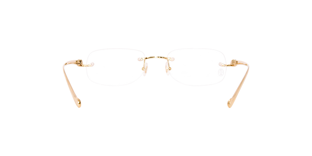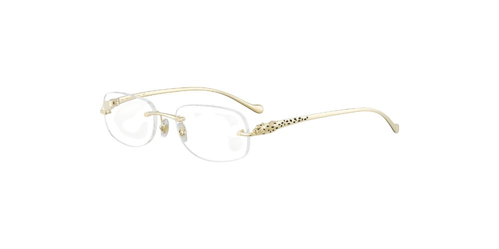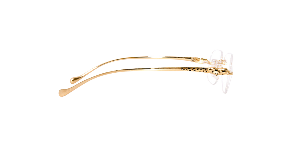Las Cartier CT0058O 00152 combinan el icónico estilo Panthère con funcionalidad óptica. Su diseño rimless aporta ligereza visual, mientras que la estructura metálica dorada con terminaciones en negro brinda un aire sofisticado. En las varillas destaca el motivo decorativo de la pantera, símbolo distintivo de la colección. La forma rectangular alargada equilibra rasgos del rostro con elegancia, mientras que las lentes transparentes permiten una adaptación precisa a tu graduación.