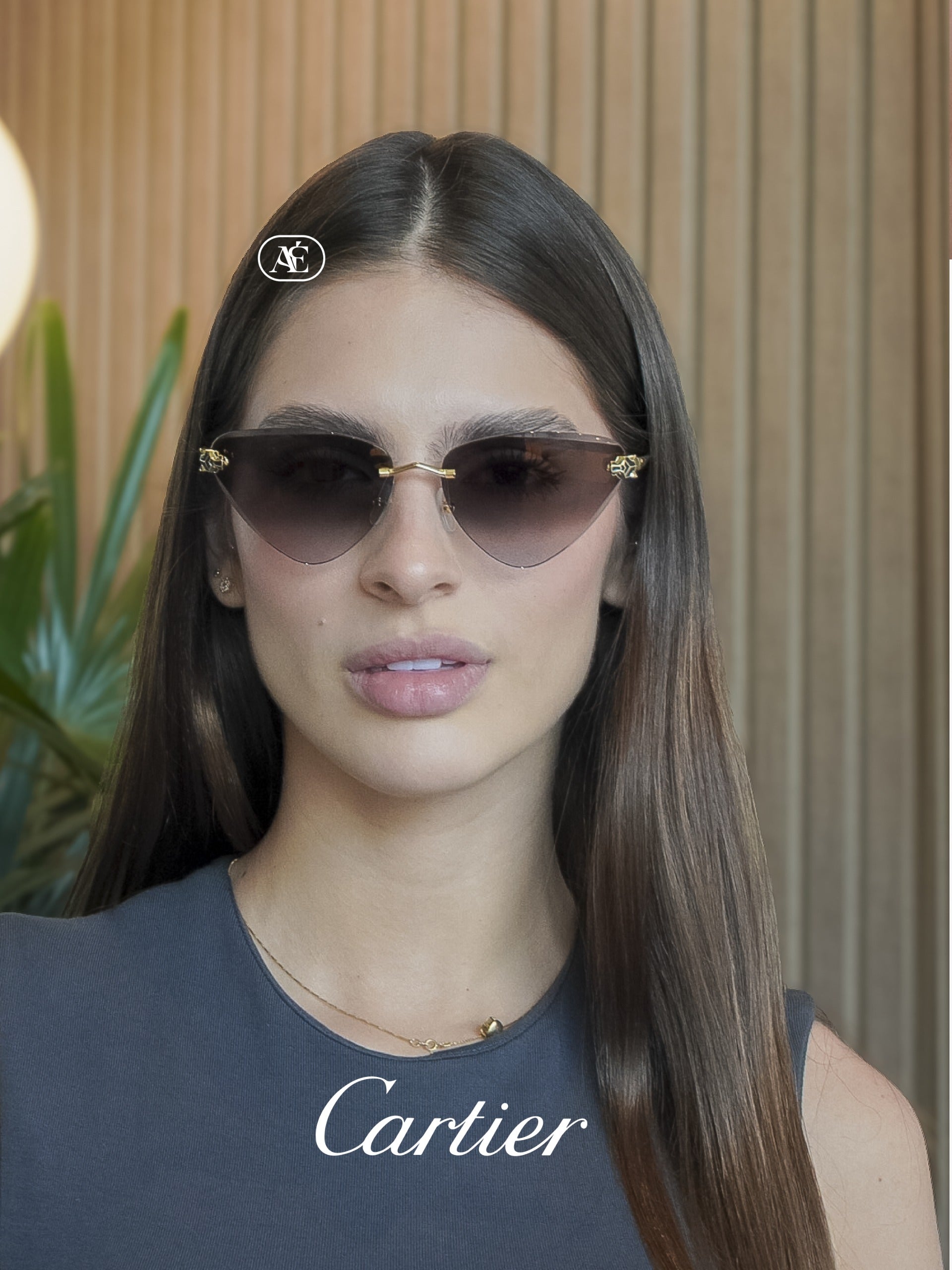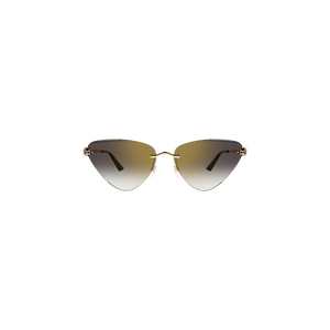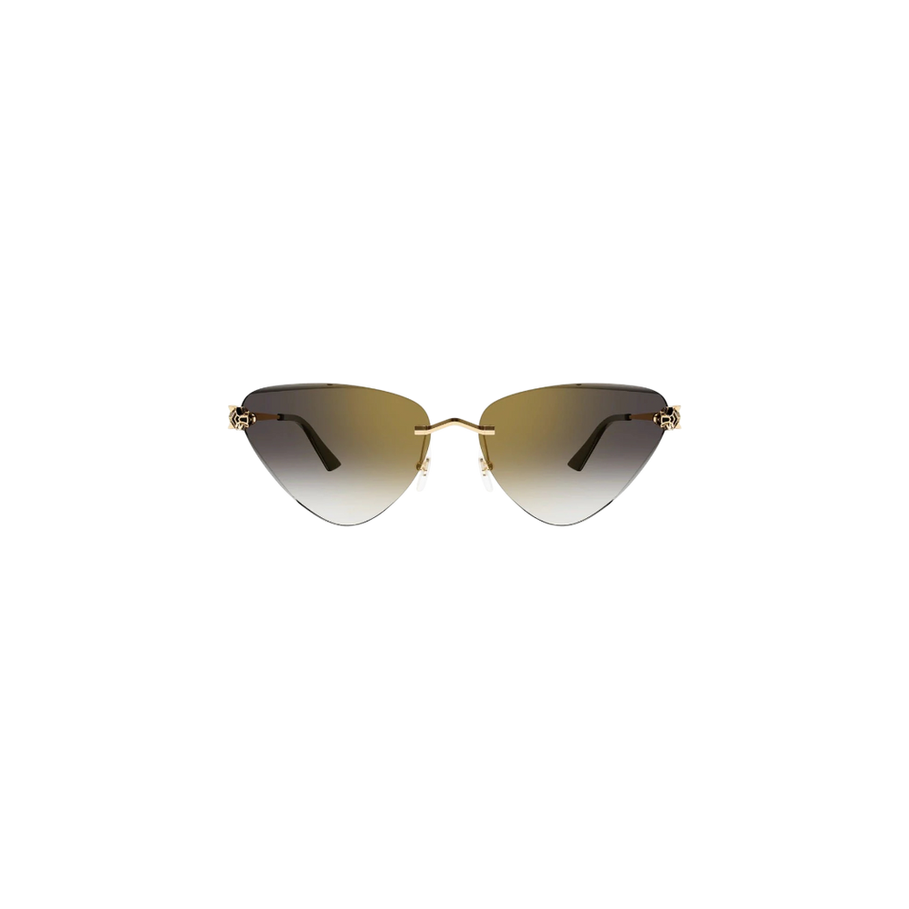 Las Cartier Panthère CT0399S-001 62 son un ícono de sofisticación y lujo. Su diseño cat-eye rimless destaca por el detalle emblemático de la pantera de Cartier, cuidadosamente trabajada en metal dorado y esmalte, que se integra a la lente como un sello de distinción. La montura en metal chapado en oro aporta elegancia y durabilidad, mientras que las lentes grises degradadas ofrecen un equilibrio perfecto entre estilo y protección.