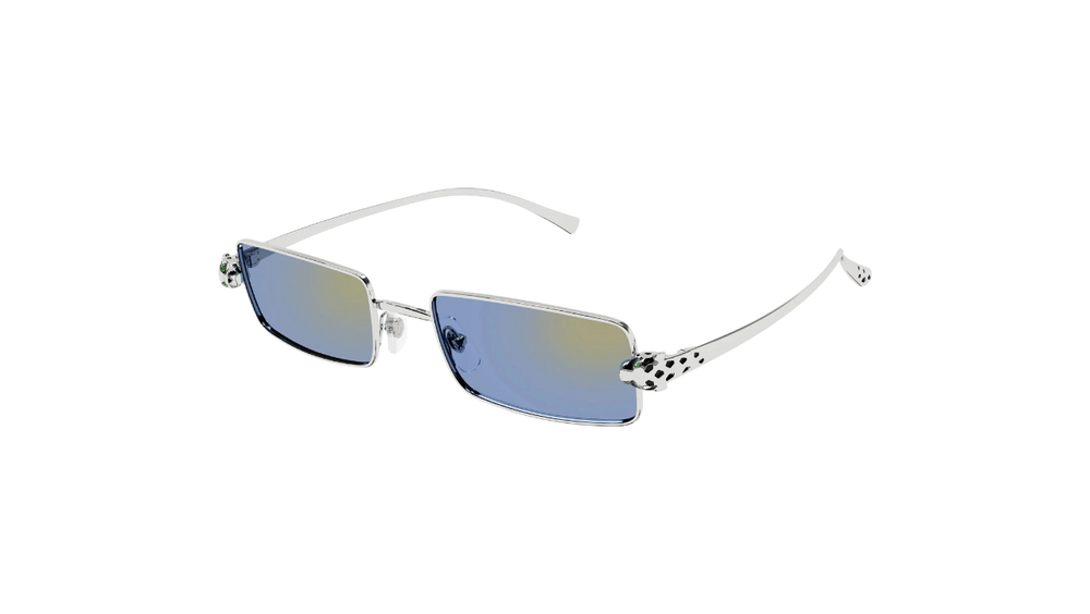 Las Cartier Panthère CT0473S 00454 reinterpretan el lujo contemporáneo con un diseño afilado, minimalista y profundamente distintivo. Su estructura metálica en acabado plateado se combina con lentes rectangulares en tono azul degradado, creando una pieza que irradia carácter y sofisticación desde cualquier ángulo.