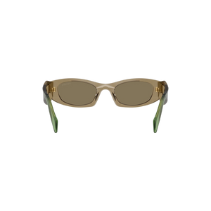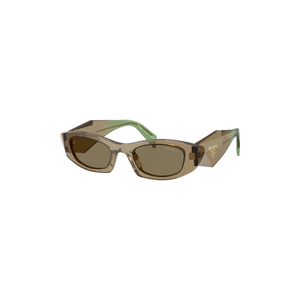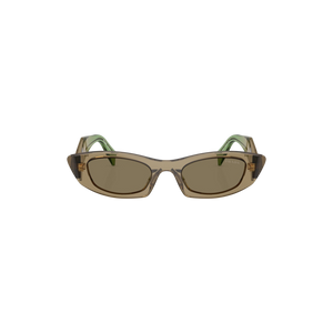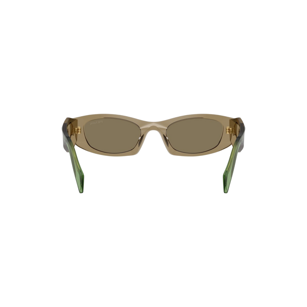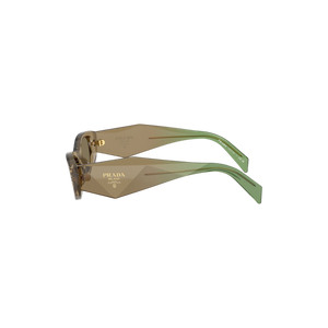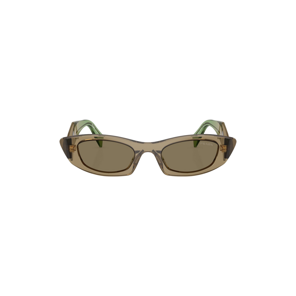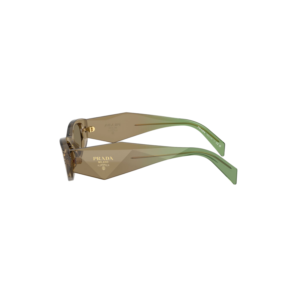 Diseño audaz y moderno con una estética vanguardista que refleja el sello inconfundible de Prada. Estas gafas presentan una montura rectangular gruesa en acetato translúcido color oliva con varillas en un tono verde esmeralda, creando un contraste sofisticado y elegante. Las líneas angulares y el logo dorado en las varillas aportan un aire contemporáneo lleno de carácter.