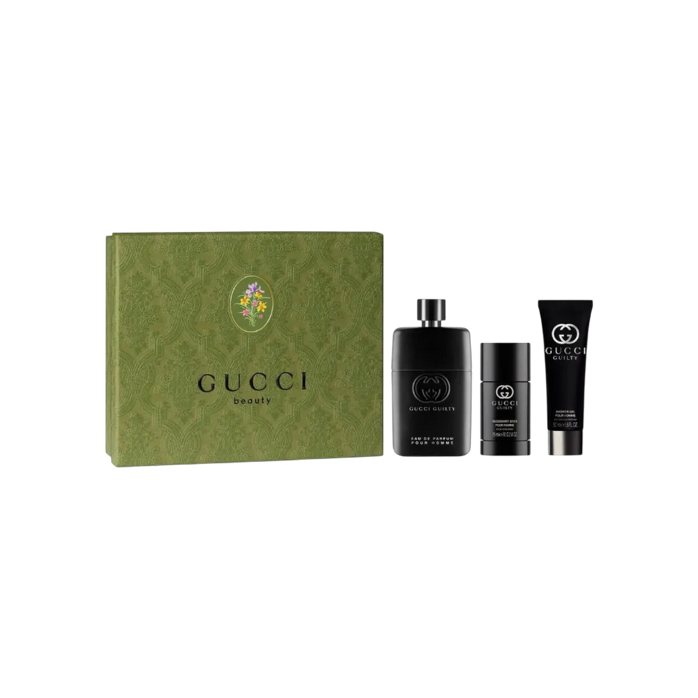Un set masculino que combina estilo y carácter con la icónica fragancia Gucci Guilty Pour Homme. Incluye el Eau de Parfum en presentación de 90 ml, un gel de ducha perfumado que potencia la frescura desde la rutina diaria y un desodorante que asegura protección y aroma durante todo el día.